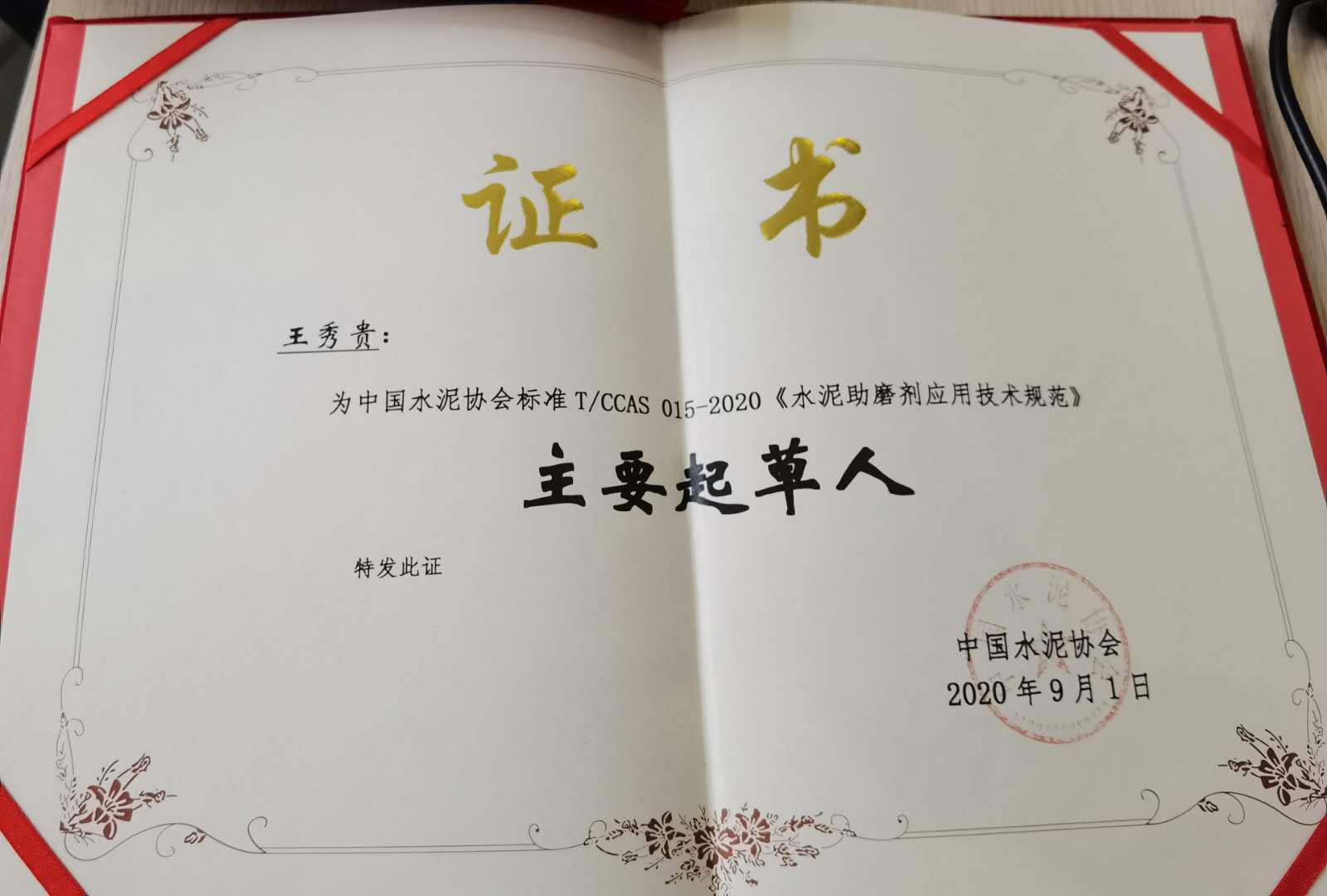 我司在為中國水泥協(xié)會(huì )標準T/CCAS 015-2020《水泥助磨劑應用技術(shù)規范》做出重要貢獻,被授予:參與起草單位